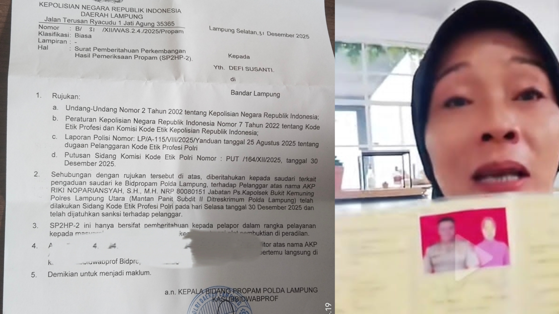 Kuasa hukum memberikan Apresiasi kepada Bid Propam Polda Lampung yang telah melaksanakan sidang kode etik profesi Polri Selasa 30 Desember 2025 dan menjatuhkan sanksi terhadap AKP Riki Nopariansyah Jabatan PS Kapolsek Bukit Kemuning Polres Lampung Utara, “ungkap kuasa hukum Defi, Rabu (31/12/2025).