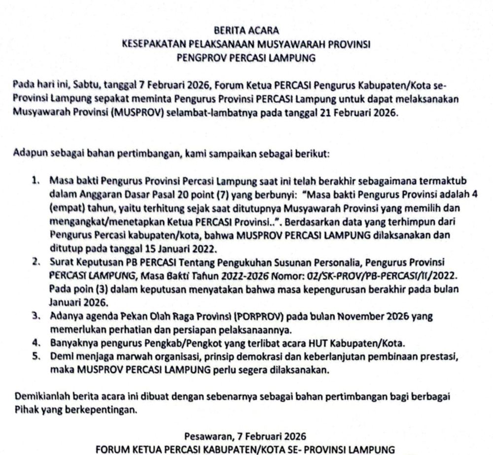 Sebelum pertemuan ini, Pengurus Kabupaten/Kota Percasi se-Provinsi Lampung telah melakukan pertemuan di RM Kapau Lempasing, pada Tgl 7 Februari 2026. Dalam pertemuan tersebut dibuatnya Berita Acara Kesepakatan dan surat usulan, meminta agar Pengprov Percasi Lampung dapat melaksanakan Musyawarah Provinsi (Musprov) Pengprov Percasi Lampung selambat-lambatnya tanggal 21 Februari 2026.