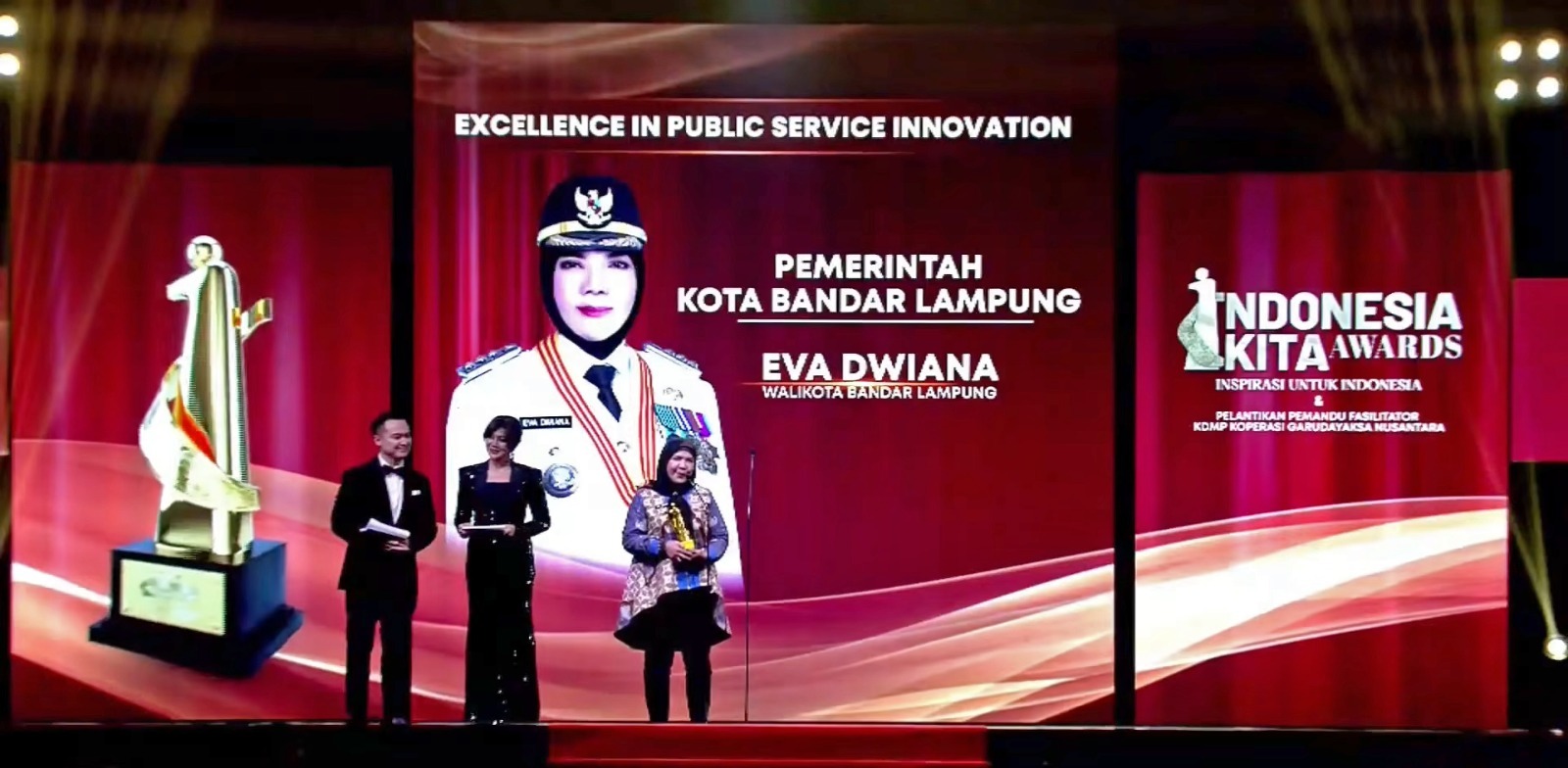 Ia berharap penghargaan ini menjadi inspirasi dan motivasi bagi seluruh elemen di Kota Bandar Lampung untuk terus meningkatkan pelayanan publik yang terbaik dan cepat melayani masyarakat, “Harap Ibu Eva Dwiana