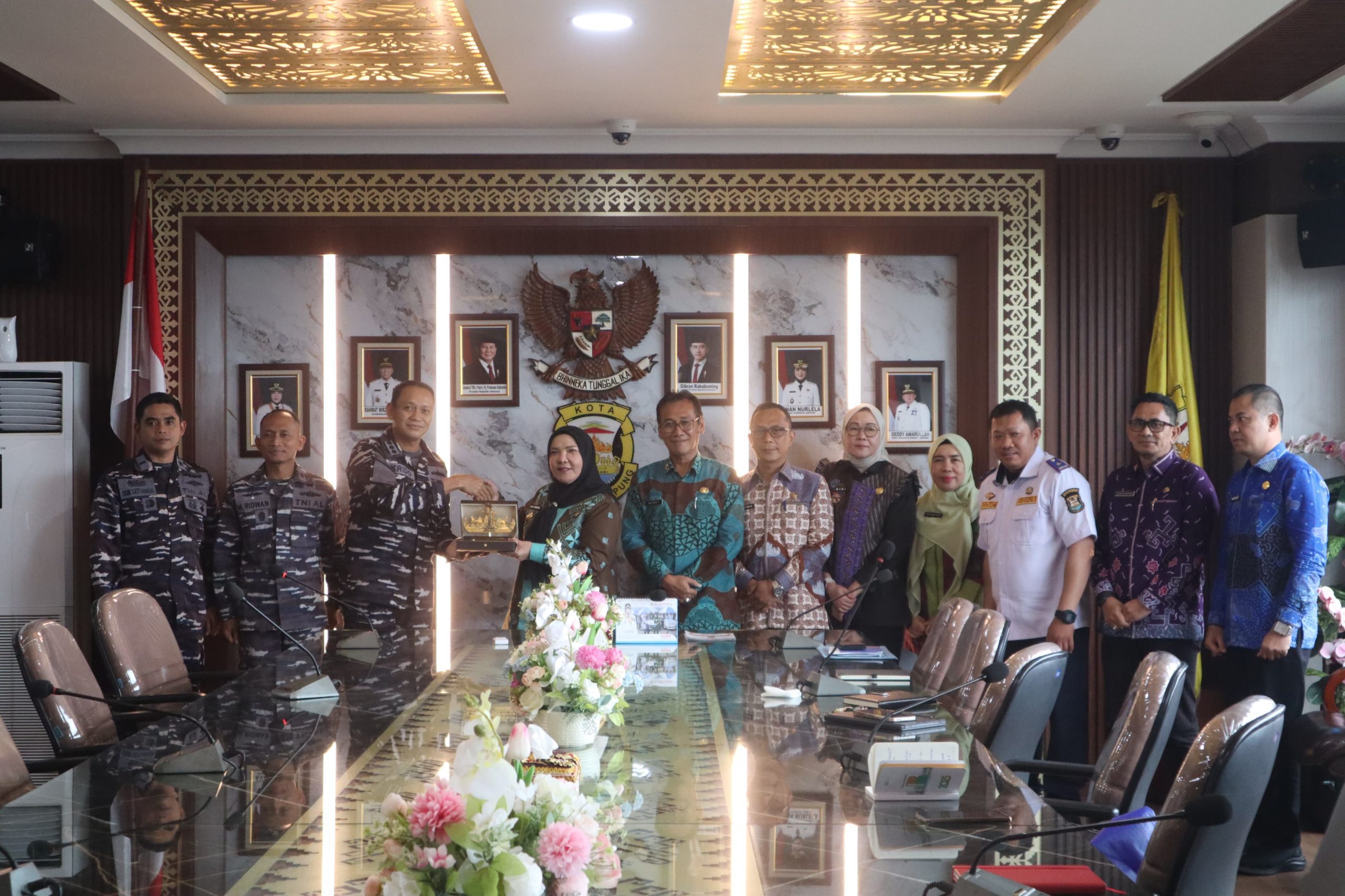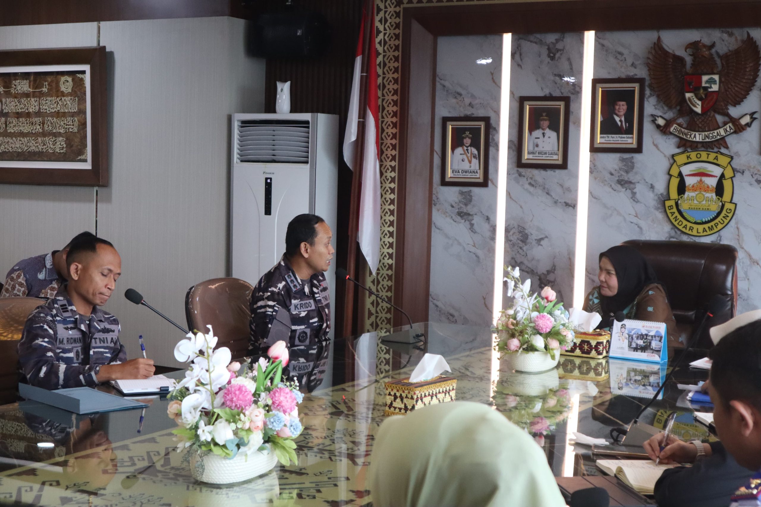 BandarLampung, Sumberpintar.com Wali Kota Bandar Lampung Hj. Eva Dwiana menerima kunjungan dan audiensi dengan Komandan Pangkalan Angkatan Laut (Danlanal) Lampung Letkol Laut (P) Krido Satriyo Utomo, S.E., M.Tr.Hanla beserta Jajanan di Ruang Rapat Walikota, Jum’at (20/02/2026).