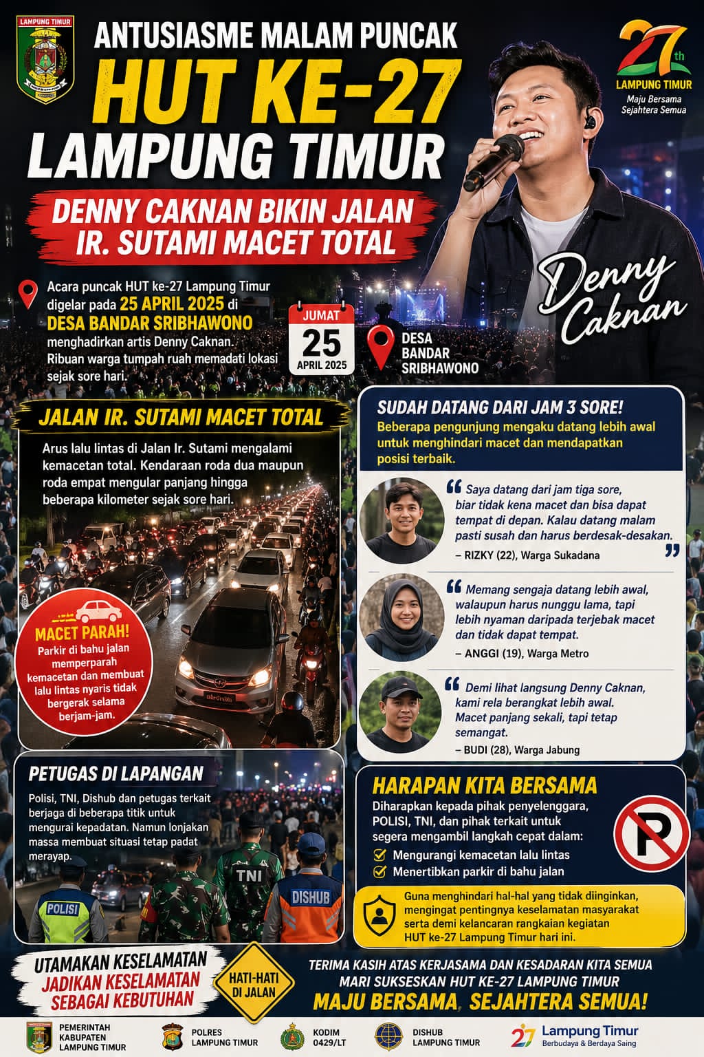 Sumberpintar.com Antusiasme masyarakat dalam menghadiri malam puncak perayaan Hari Ulang Tahun (HUT) Kabupaten Lampung Timur Ke-27 memuncak saat digelarnya acara yang menghadirkan penyanyi populer Denny Caknan.