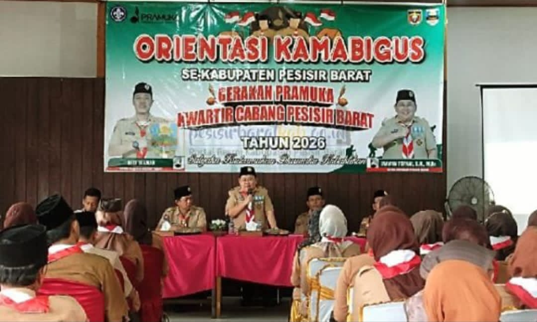 PesisirBarat, Sumberpintar.com Ketua Gerakan Pramuka Kwartir Cabang (Kwarcab) Kabupaten Pesisir Barat (Pesibar), Irawan Topani, S.H., M.Kn., membuka secara langsung Silaturahmi dan Orientasi Ketua Majelis Pembimbing Gugus Depan (Kamabigus) se-Kabupaten Pesisir Barat (Pesibar) Tahun 2026, di Aula Hotel Sunset Beach Pekon Way Redak, Kamis (29/01/2026).