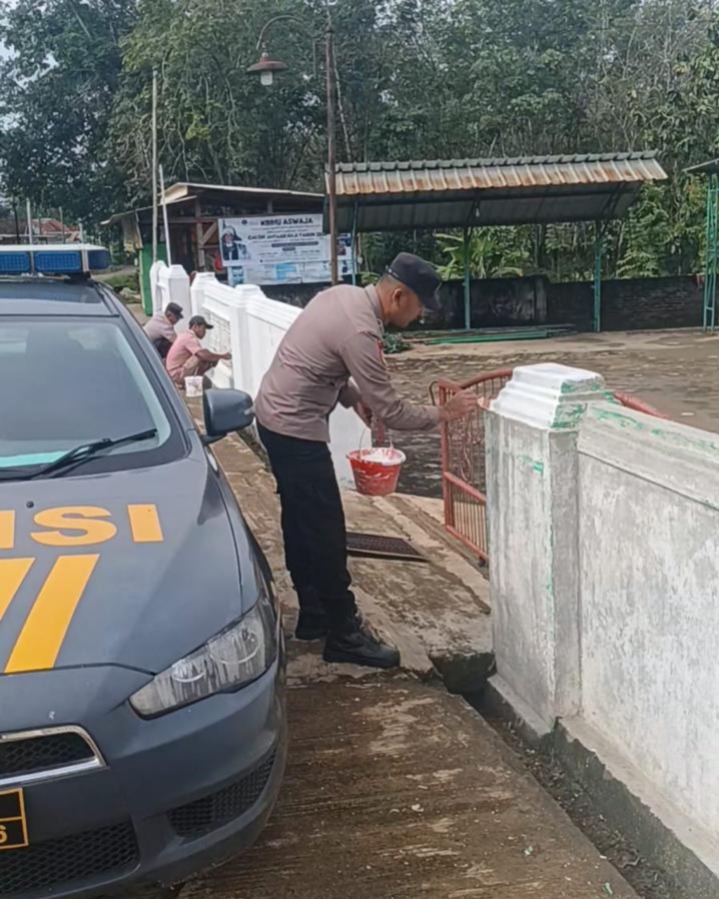Bukan sekedar bersih bersih, personel Polsek Kasui bahu-membahu bersama masyarakat dalam perbaikan sarana fisik, termasuk mengecat pagar masjid agar terlihat lebih bersih, rapi, dan cantik.