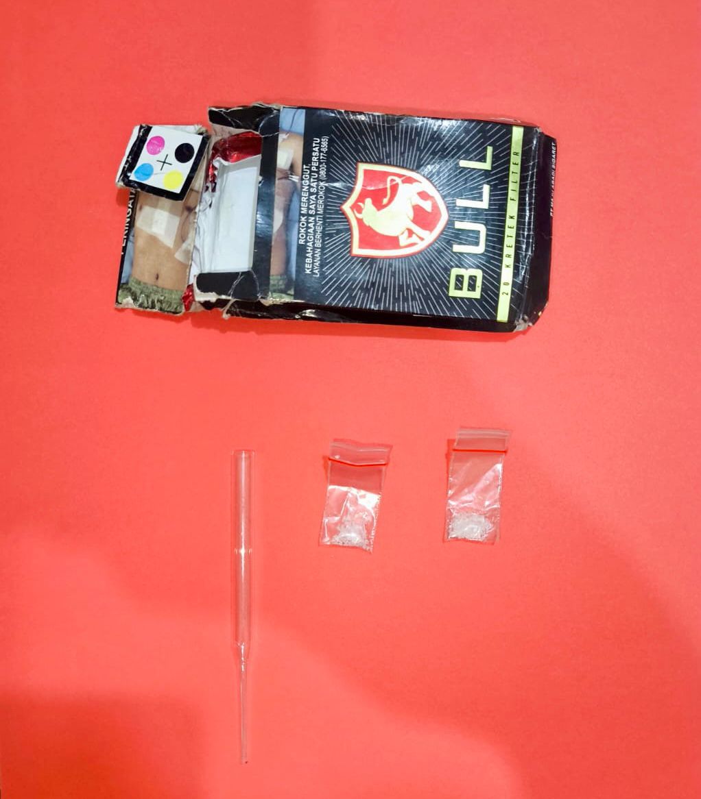 Saat dilakukan penggeledahan oleh petugas, ditemukan dua bungkus plastik klip berisi diduga sabu serta satu buah pipa kaca (pirek) yang disembunyikan di dalam bungkus rokok.