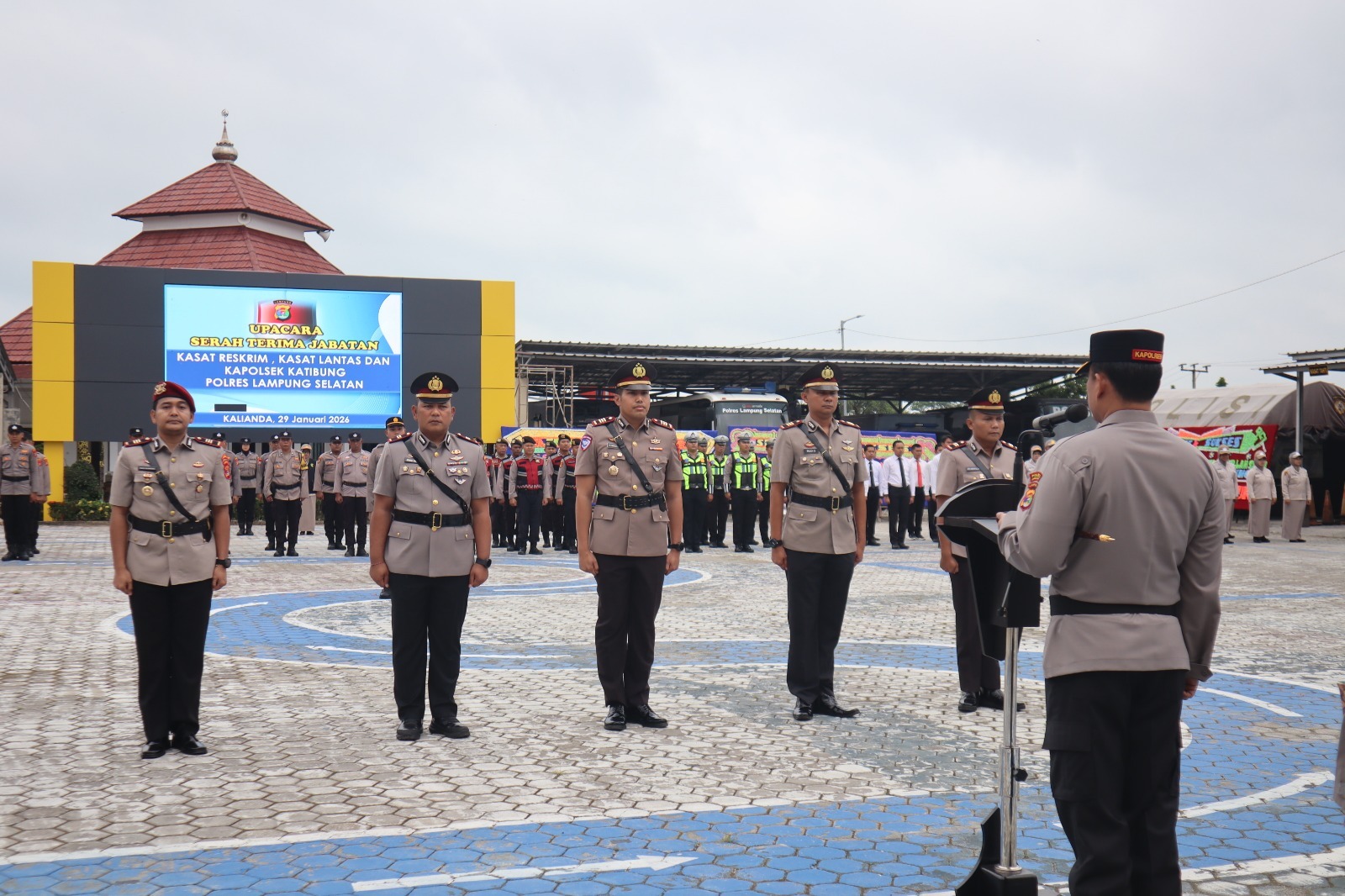 LampungSelatan, Sumberpintar.com Kepala Kepolisian Resor (Kapolres) Lampung Selatan AKBP Toni Kasmiri, S.H., S.I.K., M.H, memimpin langsung upacara serah terima jabatan (sertijab), pengambilan sumpah jabatan, dan penandatanganan berita serah terima jabatan sejumlah pejabat utama di lingkungan Polres Lampung Selatan, Kamis (29/01/2026).