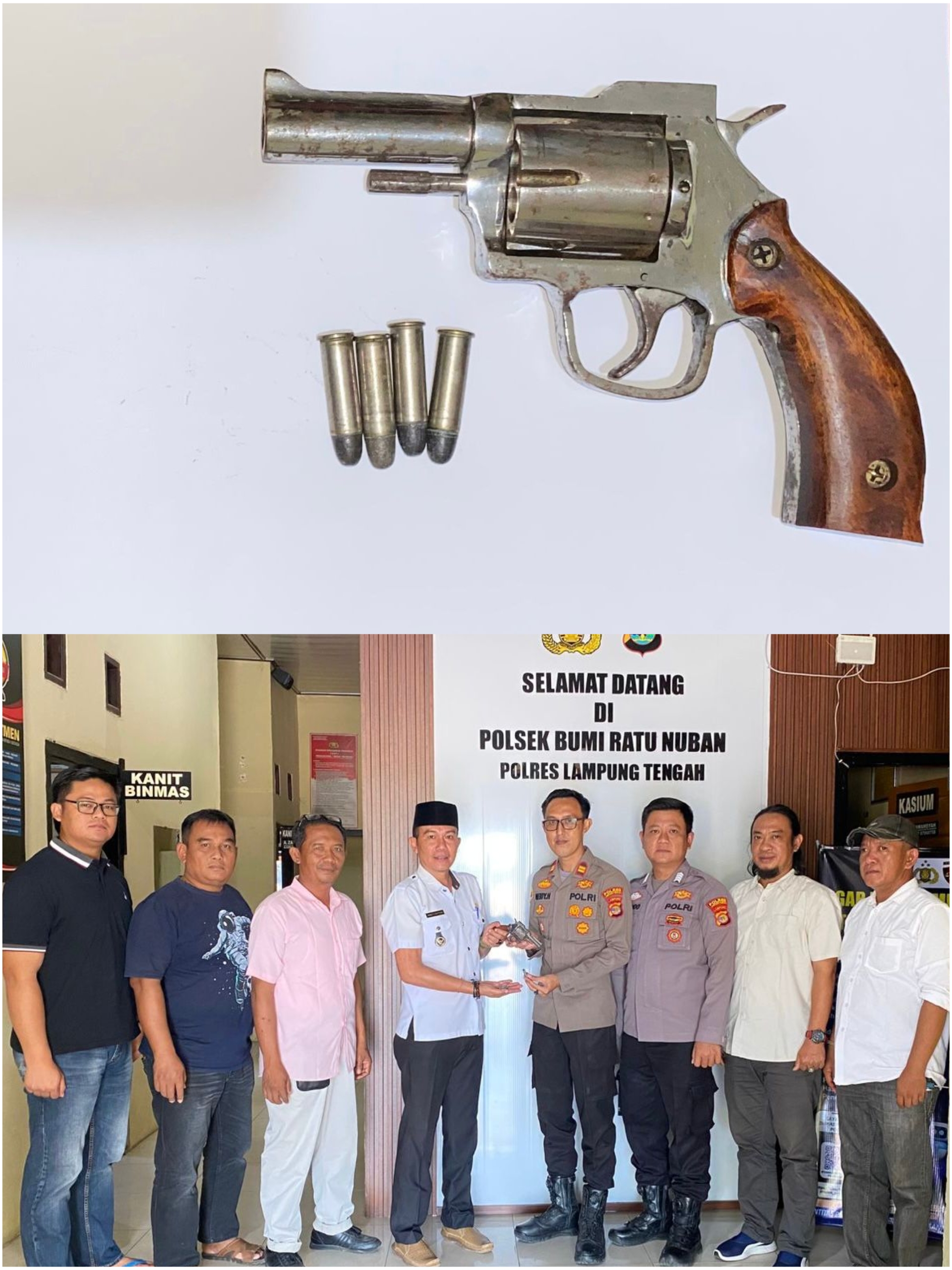 LampungTengah, Sumberpintar.com–Polsek Bumiratu Nuban, Polres Lampung Tengah menerima penyerahan 1 pucuk senjata api rakitan (senpira) jenis revolver laras pendek berwarna putih, lengkap dengan empat butir amunisi kaliber 38 mm dari tokoh masyarakat, Rabu (26/11/2025).