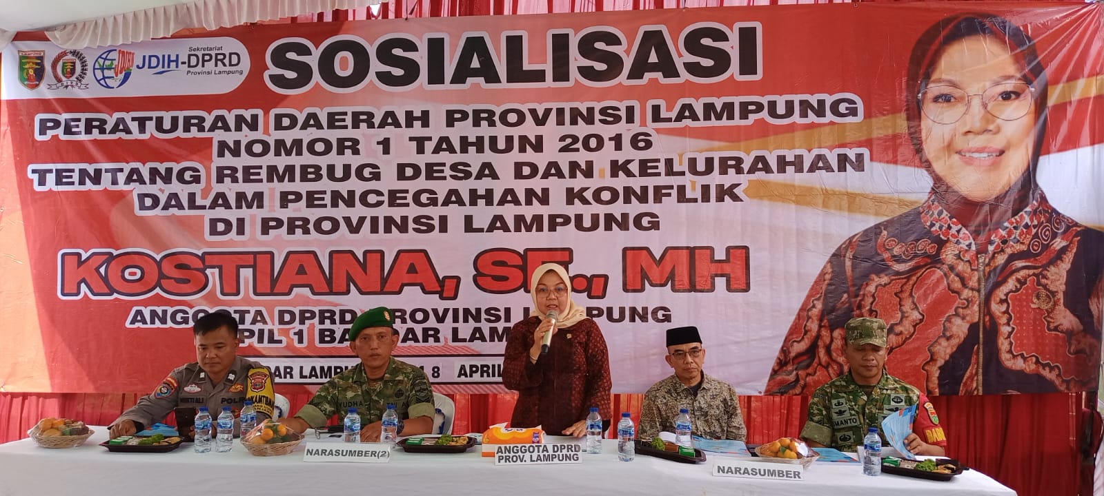 Perda no 1 tahun 2016 tentang Rembug desa dan kelurahan dalam pencegahan konflik di Provinsi Lampung, perlu disampaikan ke warga untuk aturan agar mengetahui ketika ada konflik disekitar dapat memahami melalui rembug desa dan kelurahan tidak serta merta ada konflik langsung diselesaikan ke ranah hukum namun dengan musyawarah terlebih dahulu, “ujar Kostiana.