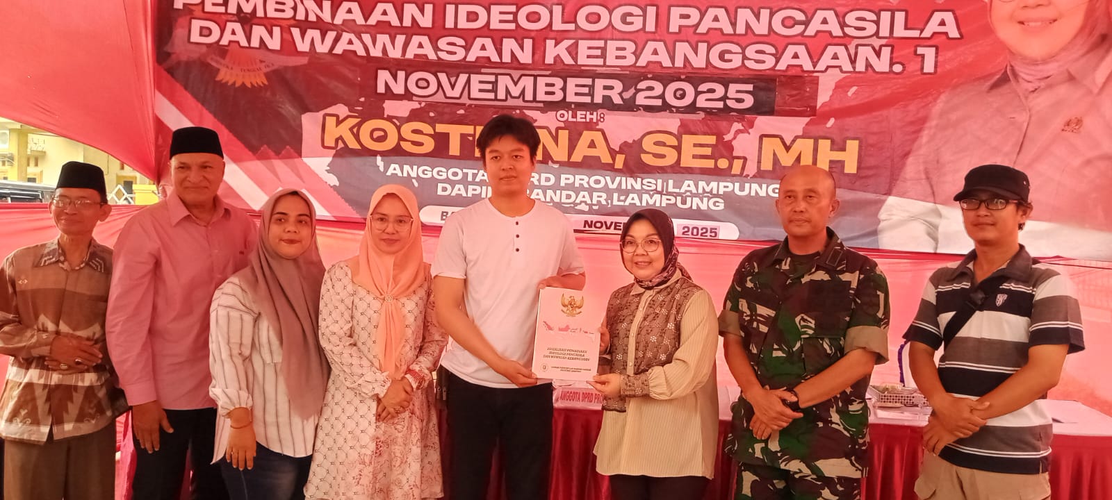 BandarLampung,Sumberpintar.com– Kostiana wakil ketua DPRD provinsi Lampung yang juga sebagai bendahara PDI Perjuangan Lampung, rutin menggelar Pembinaan Ideologi Pancasila dan Wawasan Kebangsaan, di Jl. Manggis Kampung Empang RT. O1 Lk.2 Kelurahan Pasir Gintung, Tanjung Karang Pusat, Kota Bandar.Lampung, Sabtu (08/11/2025).