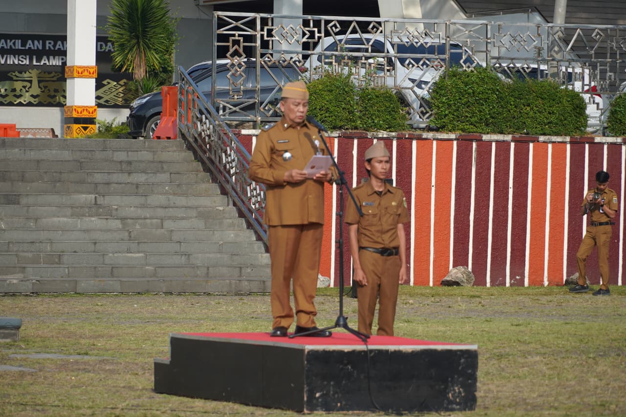 Lampung, Sumberpintar.com– Gubernur Lampung diwakili Staf Ahli Bidang Kemasyarakatan dan SDM, Lukman Pura memimpin Apel Mingguan di lingkungan Pemerintah Provinsi Lampung, bertempat di Lapangan Korpri Kantor Gubernur, Senin (20/10/2025).