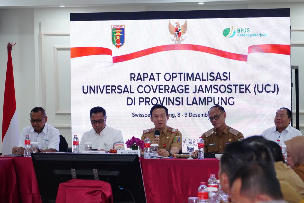 Lampung, Sumberpintar.com— Sekretaris Daerah Provinsi Lampung, Marindo Kurniawan, mewakili Gubernur Lampung, membuka Rapat Optimalisasi Universal Coverage Jaminan Sosial Ketenagakerjaan (UCJ) Provinsi Lampung di Swiss-Belhotel, Senin (8/12/2025).
