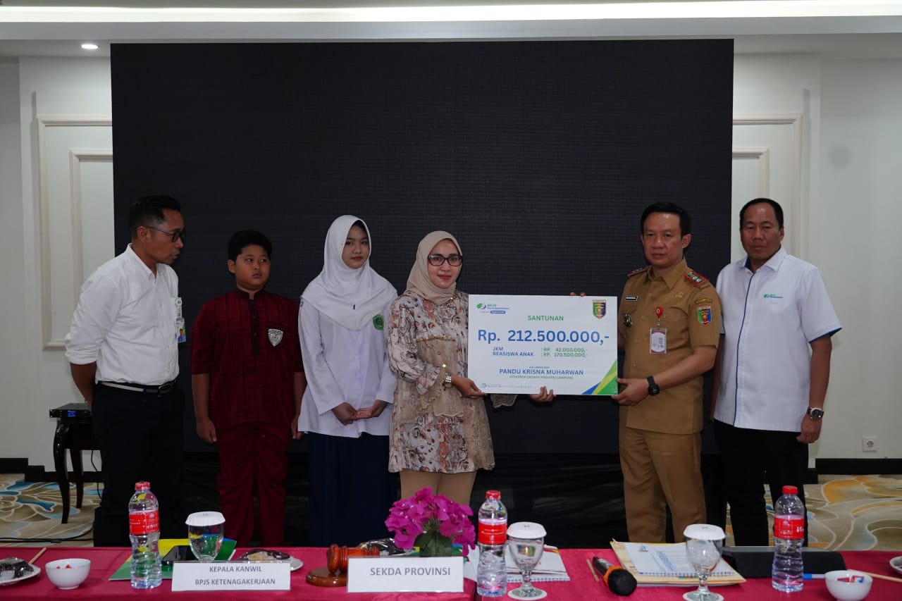 Sebagai bagian dari rangkaian kegiatan, Pemerintah bersama BPJS Ketenagakerjaan, menyerahkan santunan pertama kepada Ibu Pebi, ahli waris dari almarhum Pandu Krisna Muharwan, honorer daerah Pemprov Lampung. BPJS Ketenagakerjaan memberikan Jaminan Kematian sebesar Rp42 juta serta beasiswa untuk dua anak sebesar Rp170.500.000. Penyerahan simbolis dilakukan oleh Sekretaris Daerah Provinsi Lampung, didampingi Kepala Kantor Wilayah serta Kepala Kantor BPJS Ketenagakerjaan Bandar Lampung.