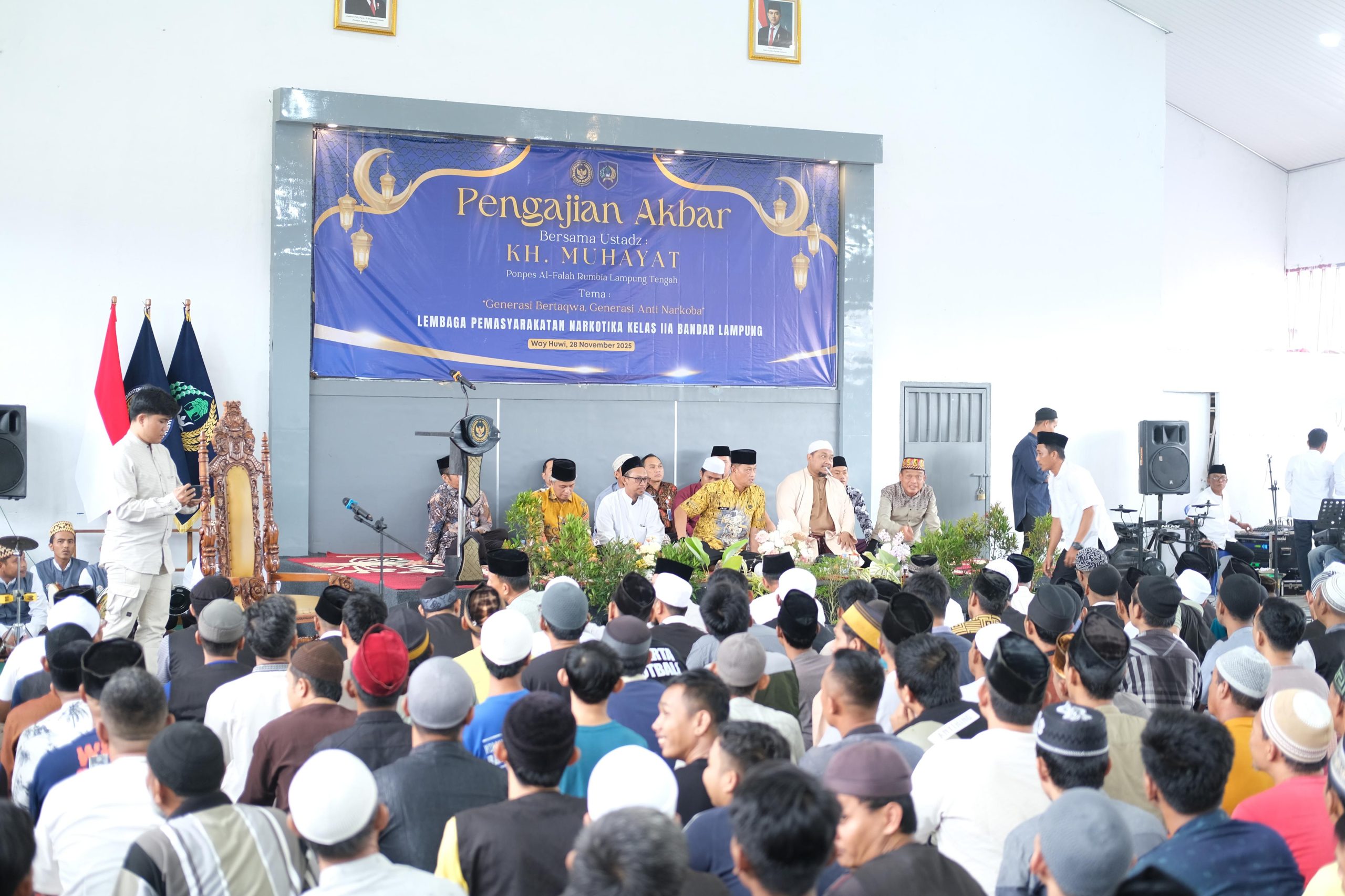 LampungSelatan, Sumberpintar.com— Lapas Narkotika Kelas IIA Bandar Lampung menggelar Pengajian Akbar bertema “Generasi Bertaqwa, Generasi Anti Narkoba” bersama KH. Muhayat, yang diikuti seluruh warga binaan dan dihadiri jajaran pimpinan pemasyarakatan serta BNNK Lampung, Jumat (28/11).