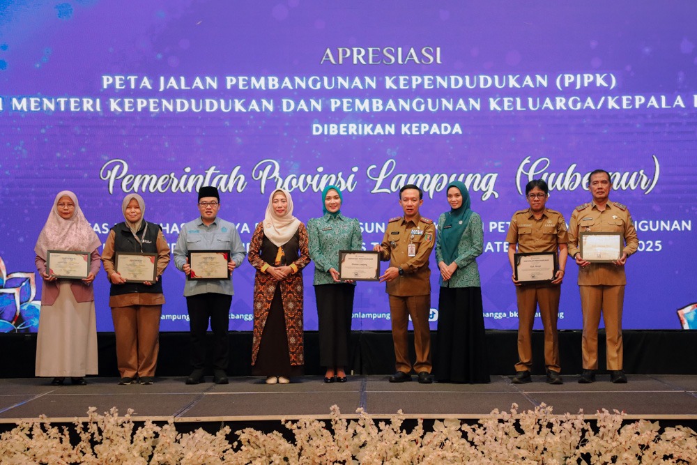 Dalam kesempatan tersebut, Pemerintah Provinsi Lampung menerima Apresiasi Peta Jalan Pembangunan Kependudukan (PJPK) dari Menteri Mendukbangga/Kepala BKKBN atas penyusunan dokumen Peta Jalan Pembangunan Kependudukan (PJPIK) berkualitas tahun 2025 yang diterima langsung oleh Ketua TP-PKK Provinsi Lampung Purnama Wulan Mirza didampingi Sekdaprov Marindo Kurniawan.