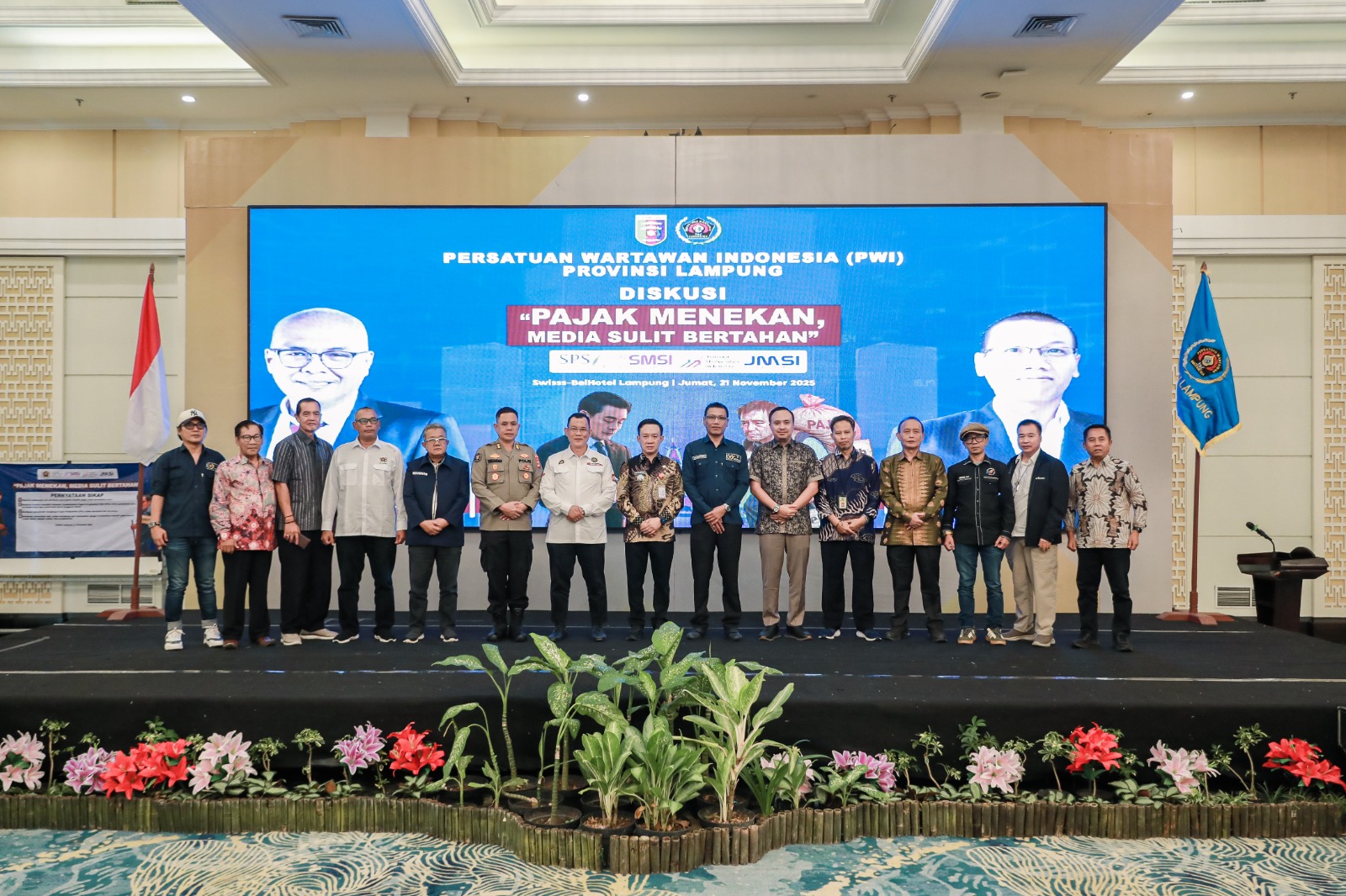 Lampung, Sumberpintar.com– Sekretaris Daerah Provinsi Lampung, Marindo Kurniawan, mewakili Gubernur Lampung Rahmat Mirzani Djausal, membuka secara resmi Diskusi Pajak bertema “Pajak Menekan, Media Sulit Bertahan” yang diselenggarakan Persatuan Wartawan Indonesia (PWI) Lampung di Ballroom Swiss-Belhotel Lampung, Jum’at (21/11/2025).