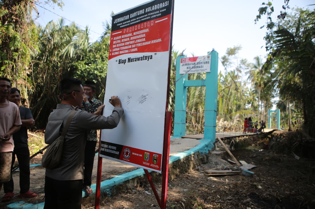 “Kegiatan perbaikan jembatan gantung di Tampang Muda saya harapkan menjadi momentum untuk menunjukkan bahwa semangat gotong royong, kebersamaan, dan kolaborasi antara unsur pemerintah dan non-pemerintah dapat menjadi senjata kita untuk menyelesaikan masalah-masalah krusial di masyarakat dengan cepat dan tuntas” Gubernur Rahmat Mirzani Djausal.