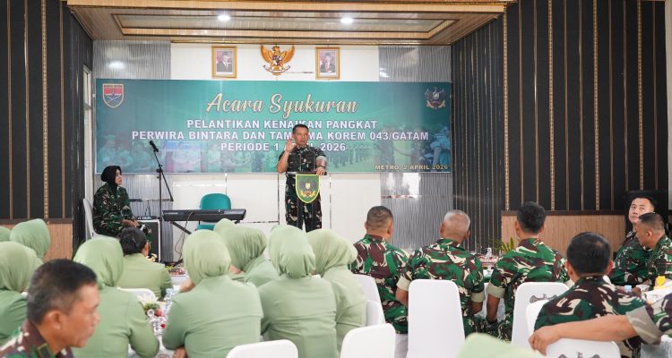 25 Orang Prajurit Naik Pangkat, Danrem 043/Gatam : Pangkat Yang Disandang Harus Diikuti Dengan Peningkatan Kualitas Diri TNI|April 2, 2026by Novis Pawarman Sumberpintar.com Komandan Korem 043/Garuda Hitam, Brigjen TNI Sumarlin Marzuki, S.E., M. Han.,