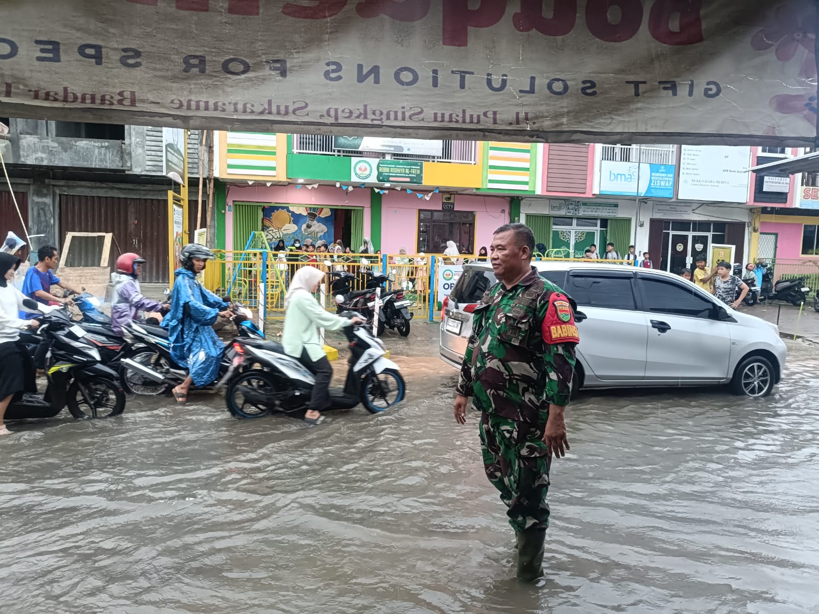 Kesigapan Babinsa Sukabumi Sertu Subianto Monitor Langsung Kondisi Genangan Air Potensi Ganggu Aktivitas Warga dan Arus Lalu Lintas