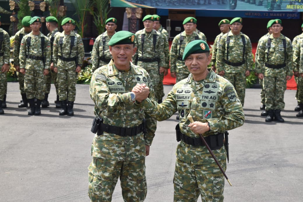 Sumberpintar.com Korem 043/Garuda Hitam (Gatam) menggelar tradisi apel penyerahan pasukan dari pejabat lama kepada pejabat baru Komandan Korem 043/Gatam, Jumat (13/03/2026). Kegiatan ini merupakan bagian dari rangkaian serah terima jabatan Danrem 043/Gatam yang sebelumnya telah dilaksanakan di Aula Pamungkas Korem 043/Gatam, Kota Metro, Kamis (12/03/2026).