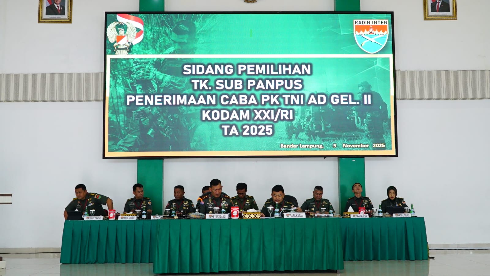 BandarLampung, Sumberpintar.com–Pangdam XXI/Radin Inten Mayjen TNI Kristomei Sianturi, S.Sos., M.Si. (Han) memimpin Sidang Pemilihan Tingkat Sub Panpus Penerimaan Calon Bintara Prajurit Karier (Caba PK) TNI AD Gelombang II TA 2025, bertempat di Aula Sudirman Makodam XXI/Radin Inten, Jl. Teuku Umar No. 85, Kelurahan Penengahan, Kecamatan Kedaton, Kota Bandar Lampung, Rabu (05/11/2025).