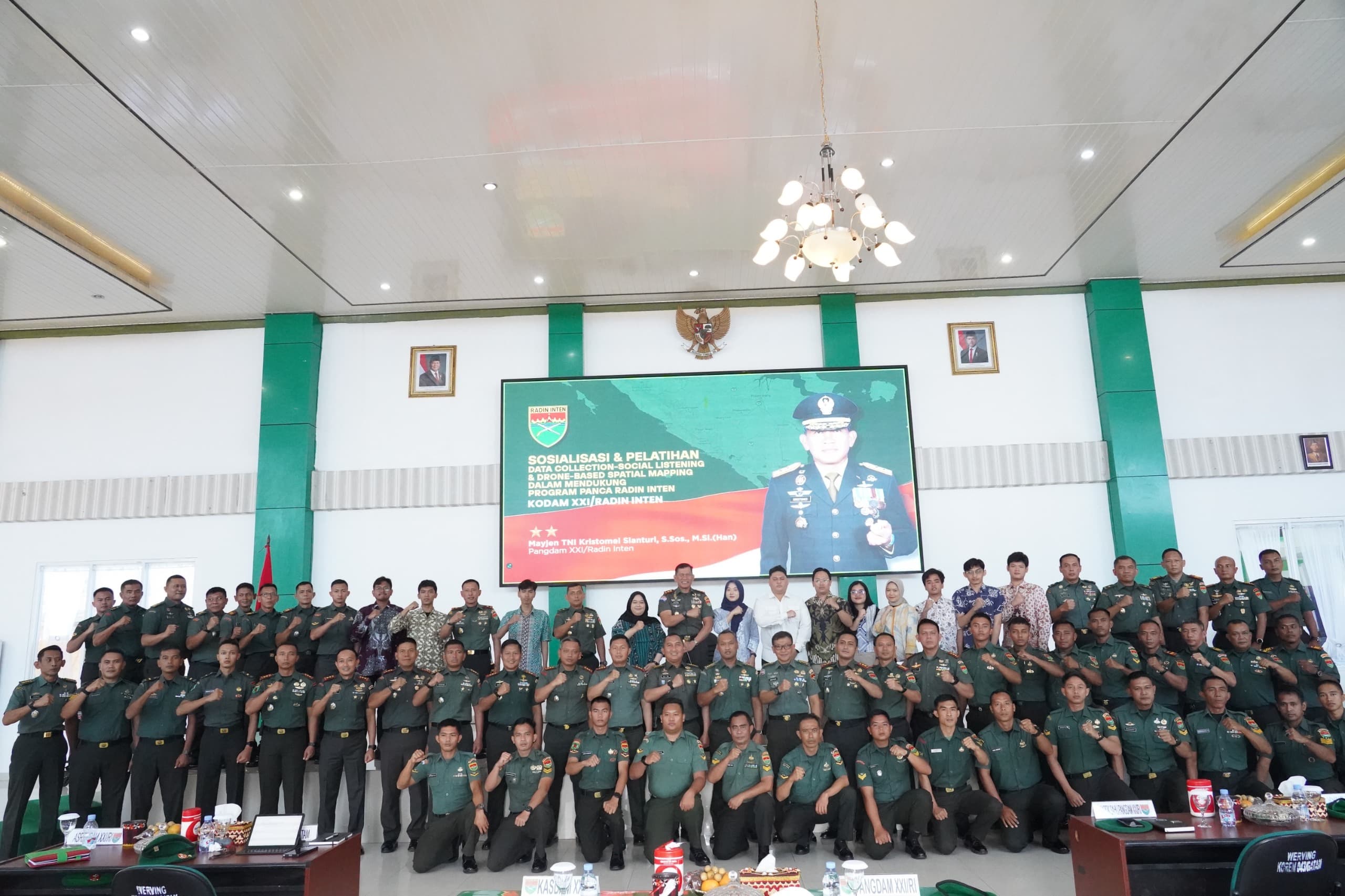 Lampung,Sumberpintar.com–Dalam rangka mendukung program Panca Raden Inten, Kodam XXI/Raden Inten menggelar kegiatan Sosialisasi dan Pelatihan Collection Social Listening serta Drone Based Spatial Mapping, yang dibuka secara resmi oleh Pangdam XXI/Raden Inten Mayjen TNI Kristomei Sianturi, S.Sos., M.Si.(Han), bertempat di Aula Sudirman Makodam XXI/Raden Inten, Jl. Teuku Umar, Penengahan, Bandar Lampung, Senin (27/10/2025).