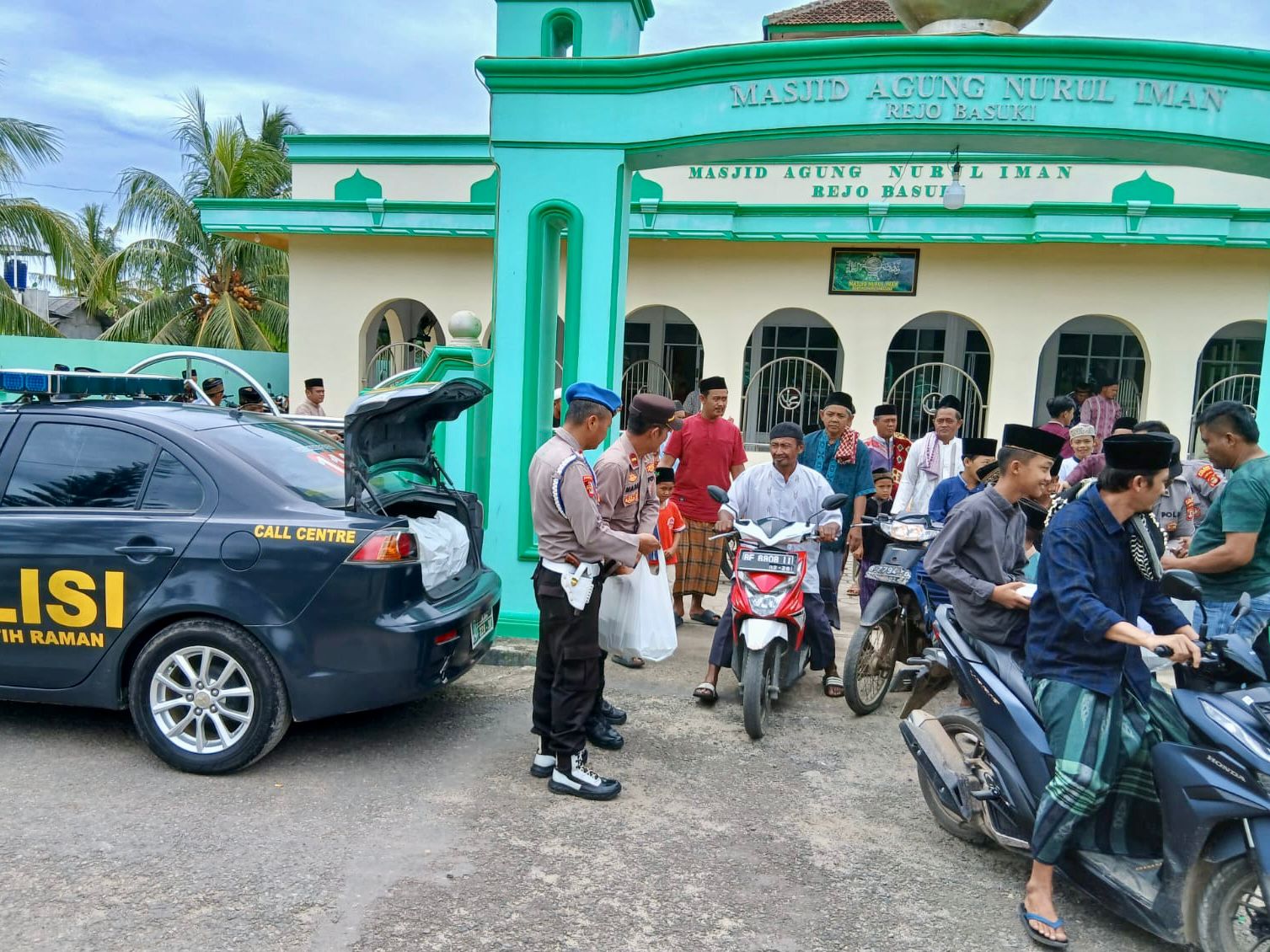 LampungTengah, Sumberpintar.com–Sebagai wujud kepedulian Polri terhadap masyarakat, jajaran Polsek Seputih Raman, Polres Lampung Tengah, melaksanakan kegiatan berbagi nasi kotak usai Salat Jumat di Masjid Agung Nurul Iman, Kampung Rejo Basuki, Kecamatan Seputih Raman, Jum’at (24/10/2025).